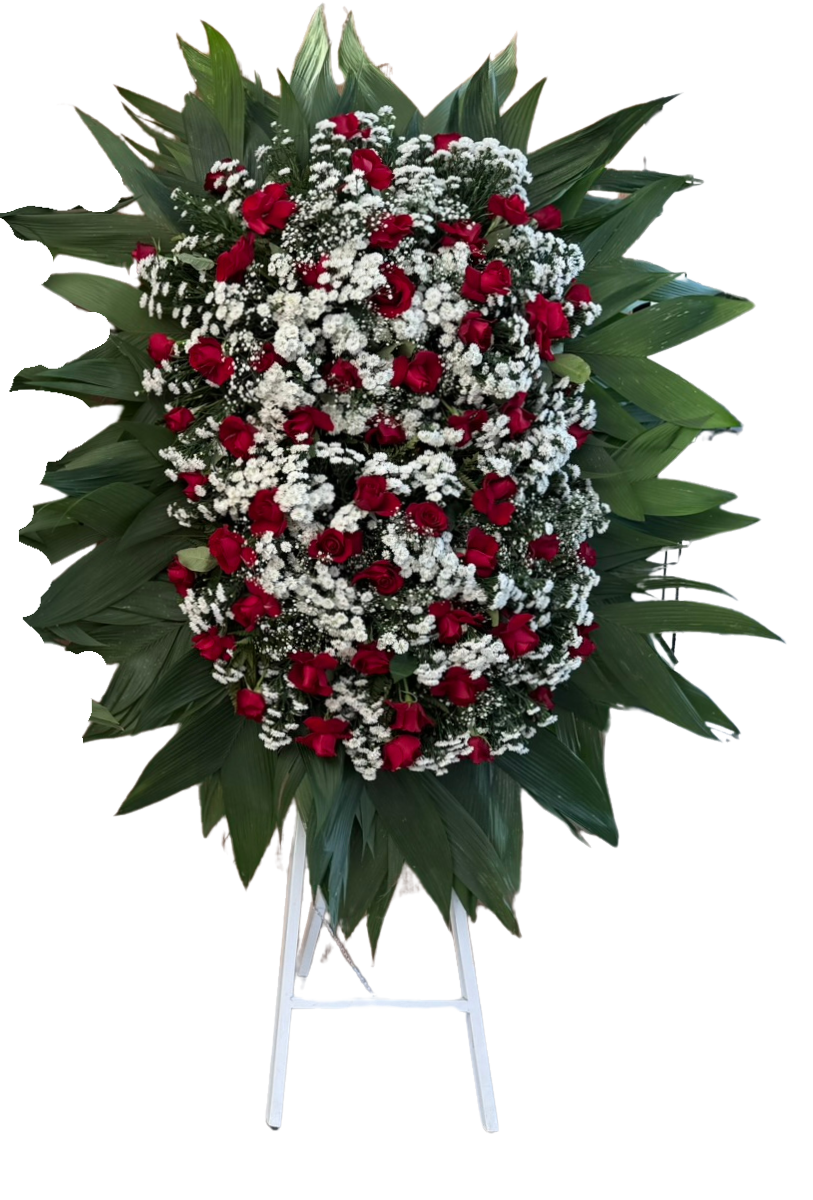Coroa composta por tango, rosas vermelhas, mosquitinho. Modelo exclusivo Luto Curitiba.